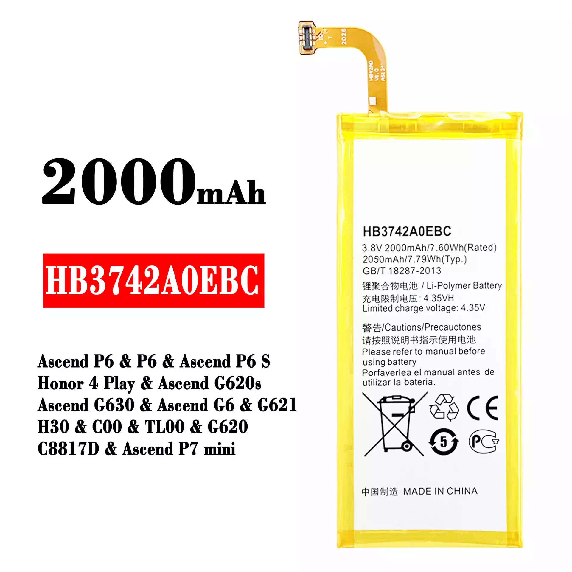 Batéria HB3742A0EBC pre HUAWEI Ascend P6 / P6 / Ascend P6 S / Honor 4 Play / Ascend G620s / Ascend G630 / Ascend G6 / G621 / H30 / C00 / TL00 / G620 / C8817D / Ascend P7 mini